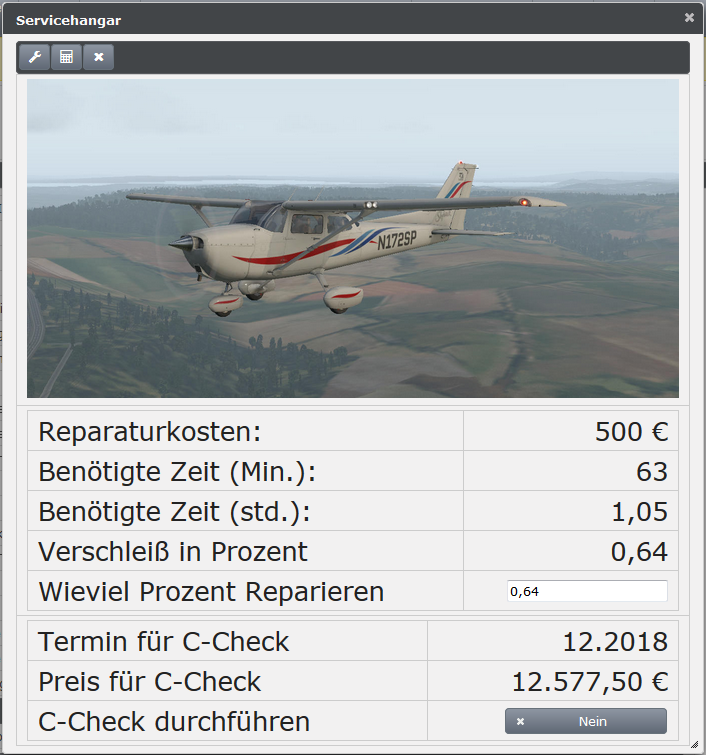 Alle 6 Monate ist bei den Flugzeugen ein C-Check durchzuführen. Ist der C-Check fällig, kann das Flugzeug nicht mehr bewegt werden. Bei einem C-Check wird die Maschine repariert und auf einen 100 prozentigen Zustand gebracht. Die Kosten für den C-Check und die Reparaturkosten sind im Hangar unter Service-Hangar zu finden.